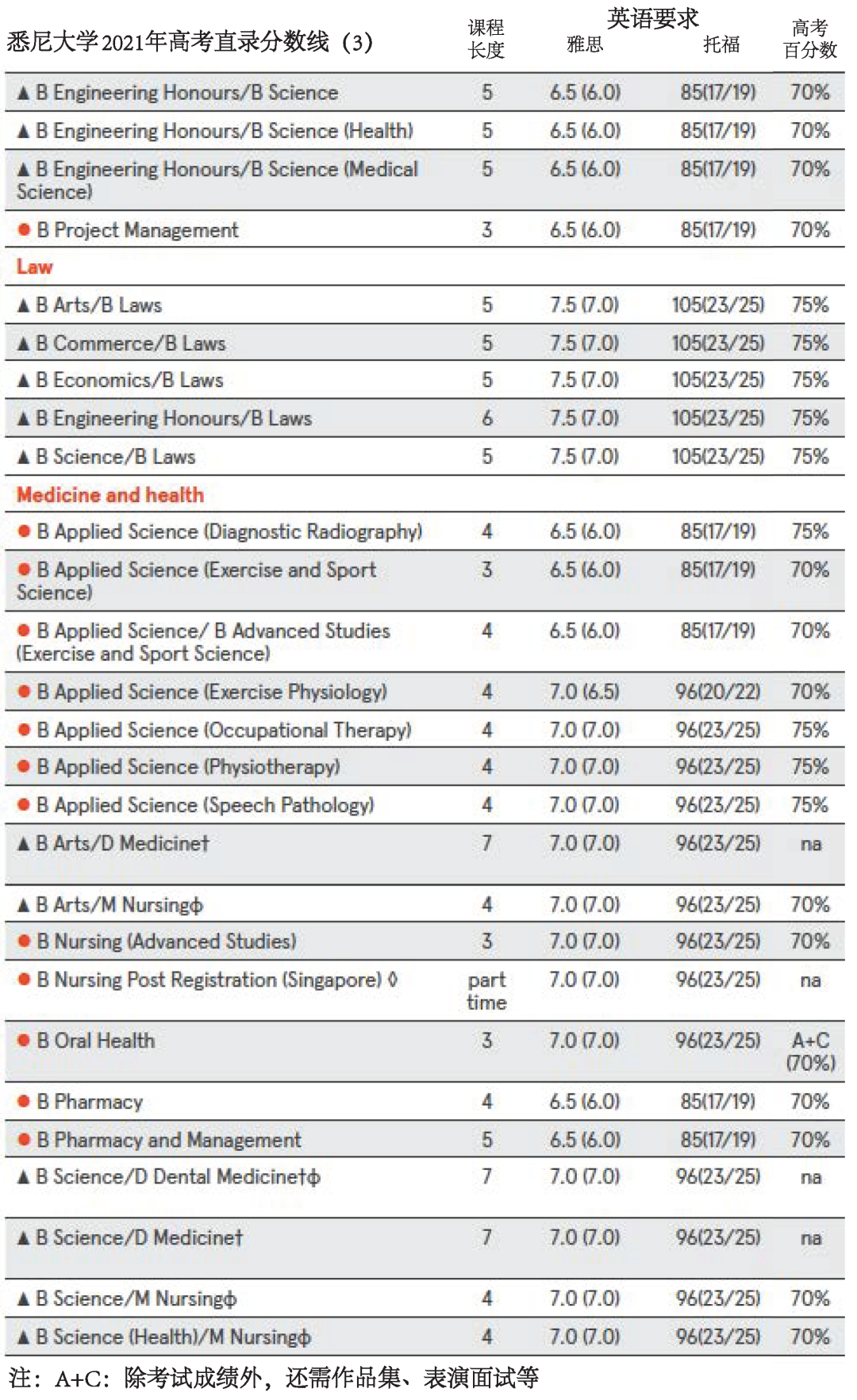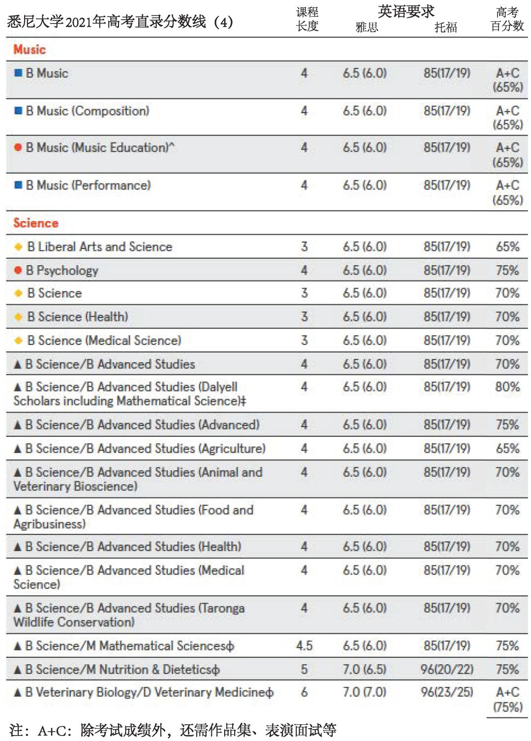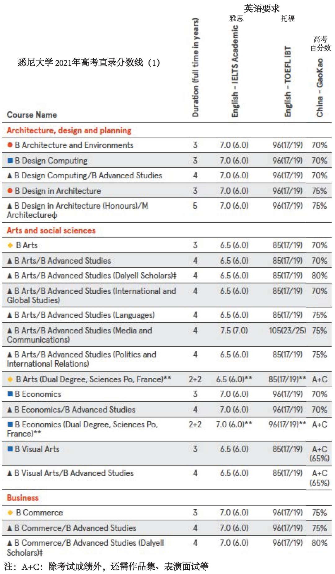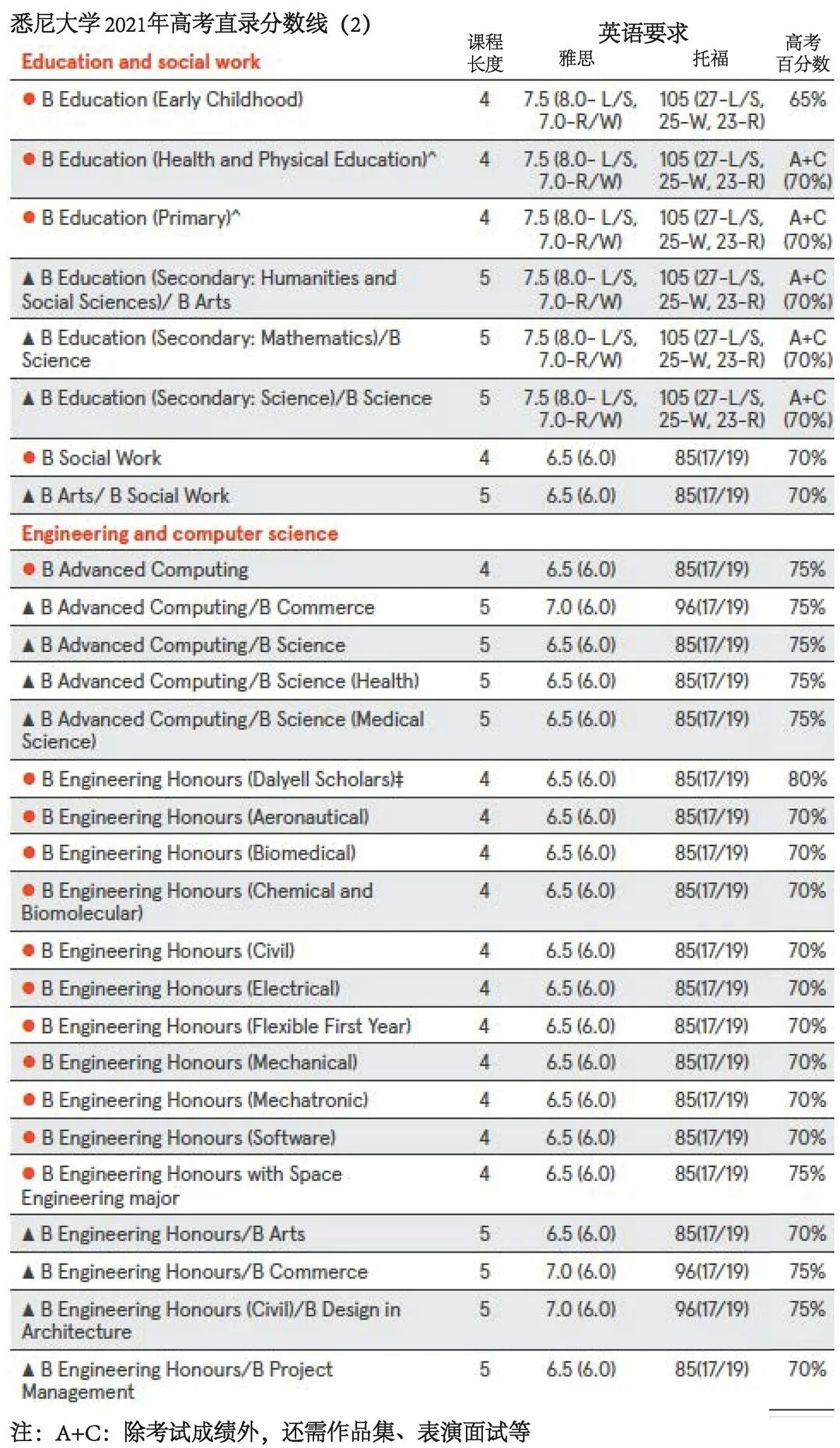 悉尼大学按照百分比录取,绝大多数课程需要高考70%、75%或80%(即全国卷525,563和600分),而幼教、音乐等少数课程65%(488分)即可,详情见下图:
