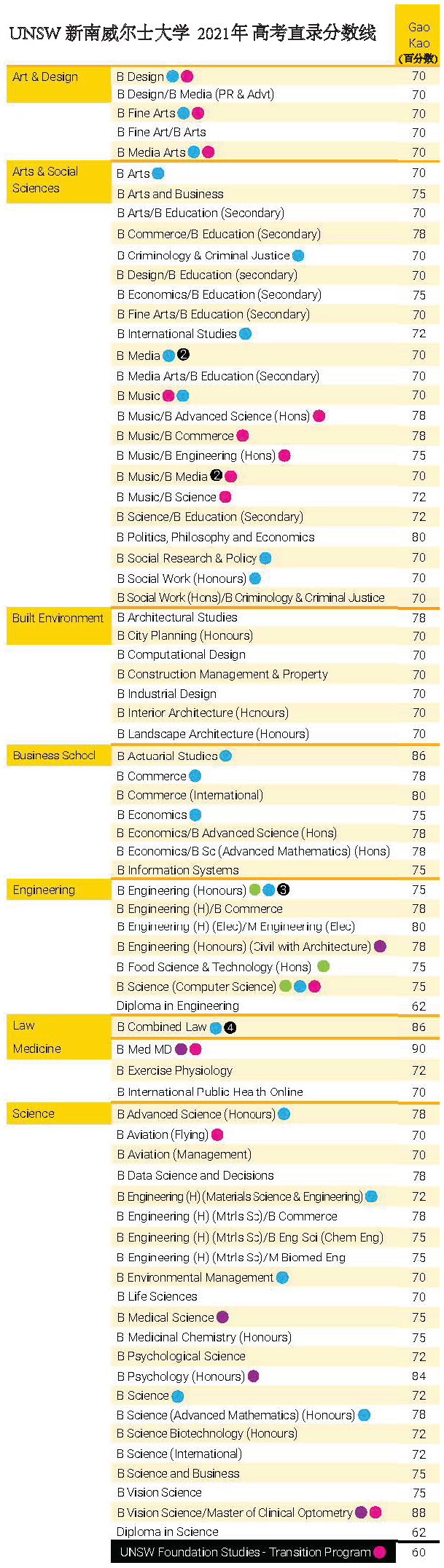 在高考录取方面,新南威尔士大学也制定了详细的录取百分比,绝大多数课程集中在高考分数70-78%(全国卷525-575分)、雅思6.5-7分的范围内,详情见下表: