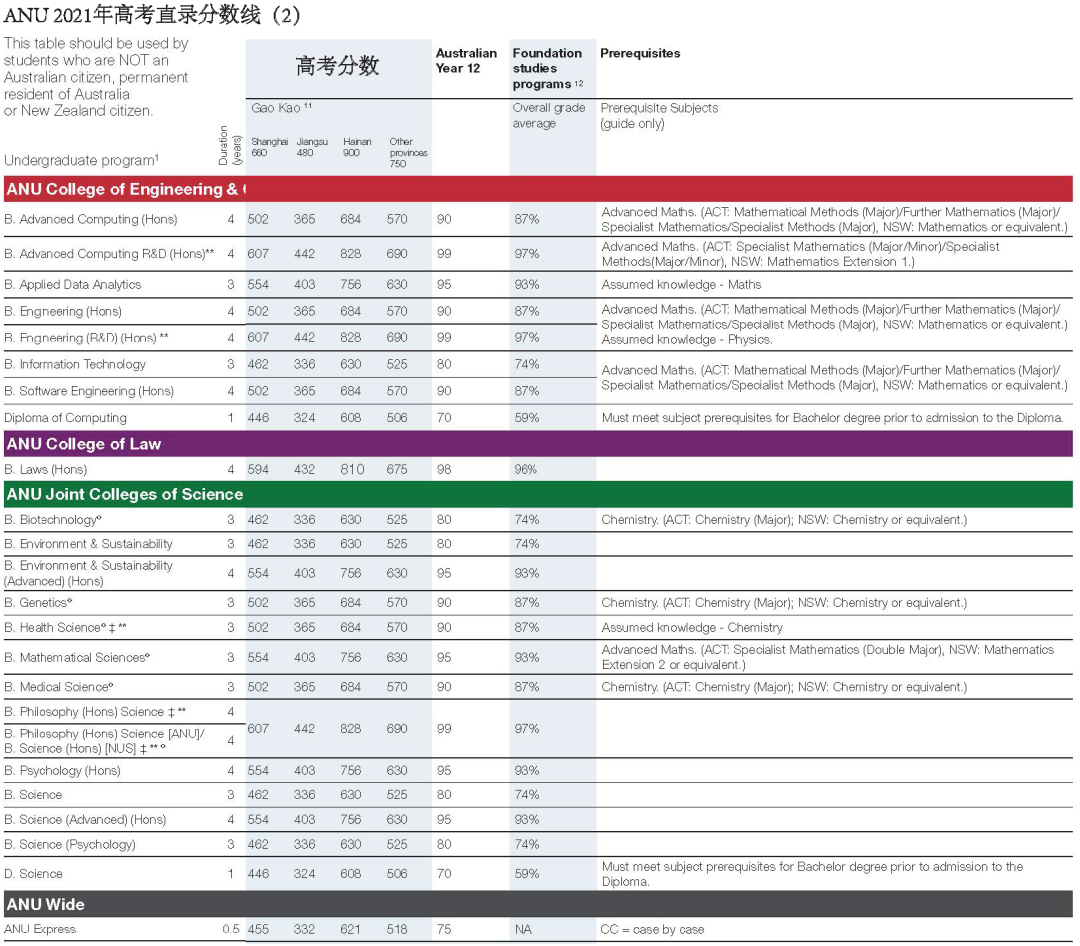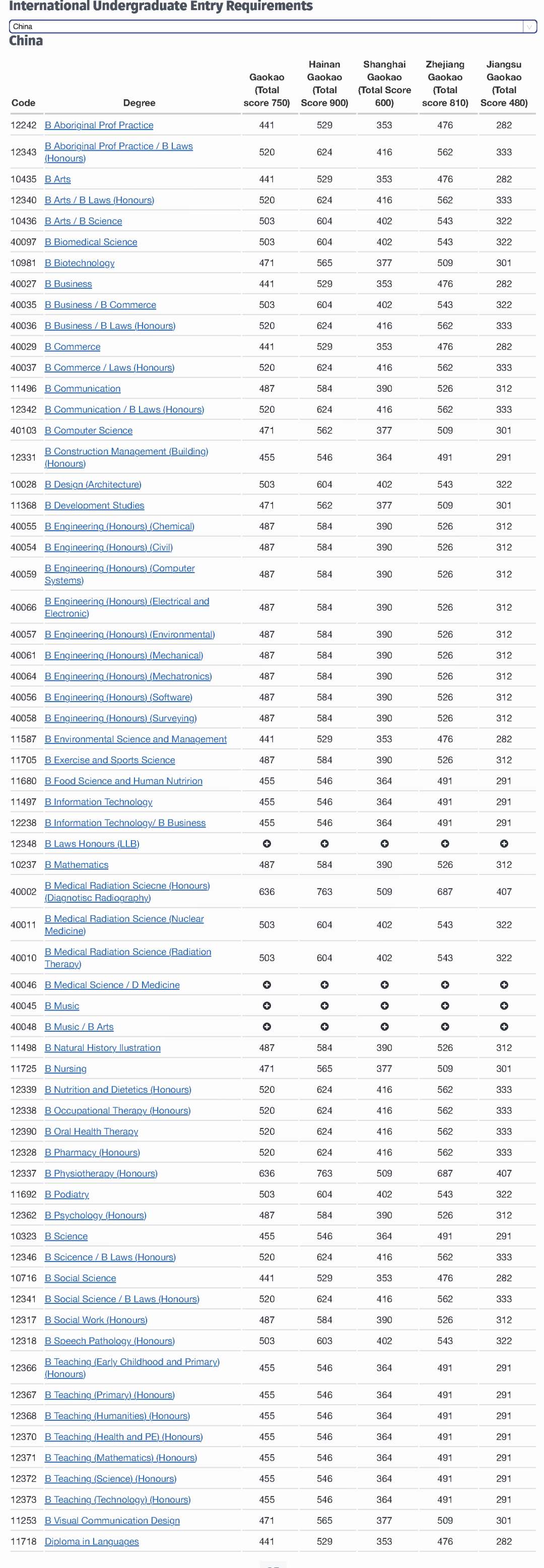 相比之前两所大学,麦考瑞大学逐一列举了每种高考试卷(海南卷、江苏卷、上海卷和750分的全国卷、北京卷等)的录取分数线,可谓详细很多。以全国卷为例,绝大多数课程的录取分数线都在420-548分、雅思6.5-7.5分(详情见下图)。