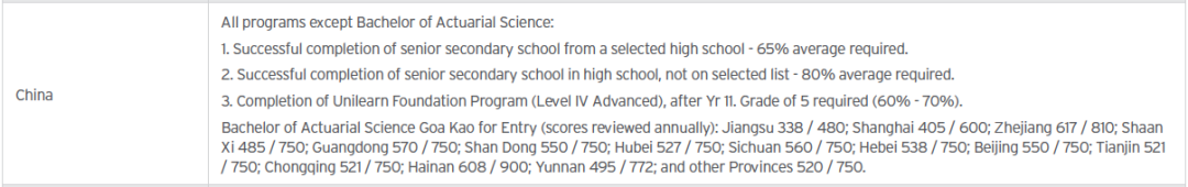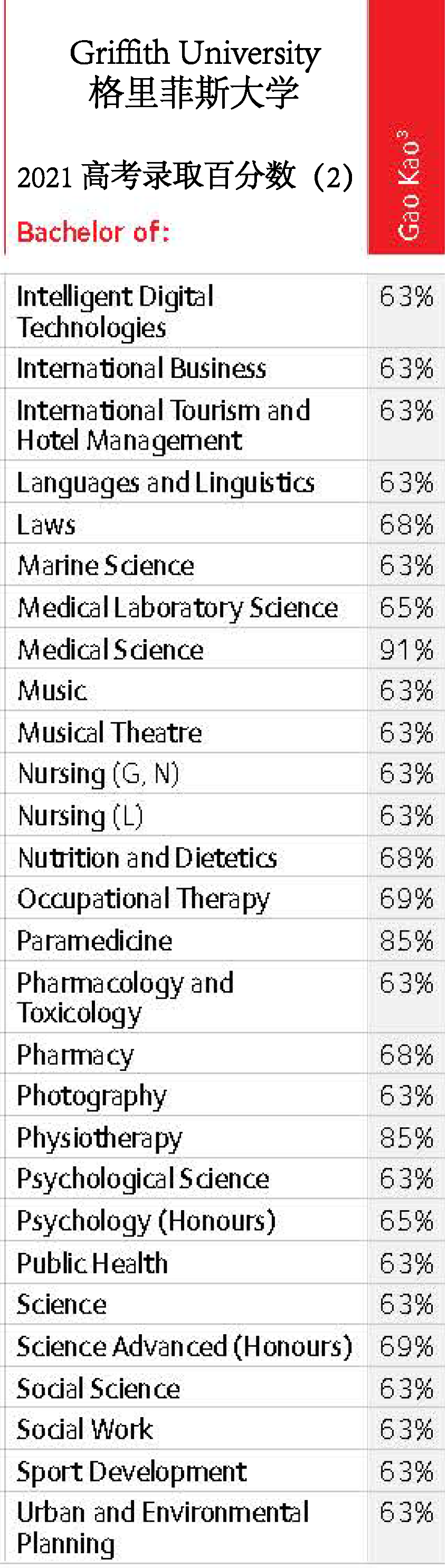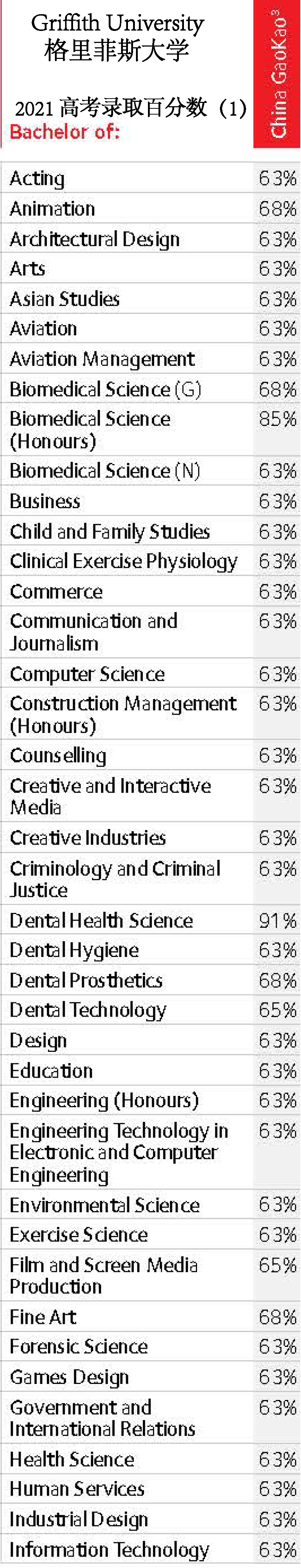 在高考录取方面,格里菲斯大学采取百分制,绝大多数专业需要63%(全国卷472.5分)、雅思总分6.5;而表演艺术、心理学及部分健康科学专业,则需要65-68%(全国卷487.5-520分)、部分雅思7分。