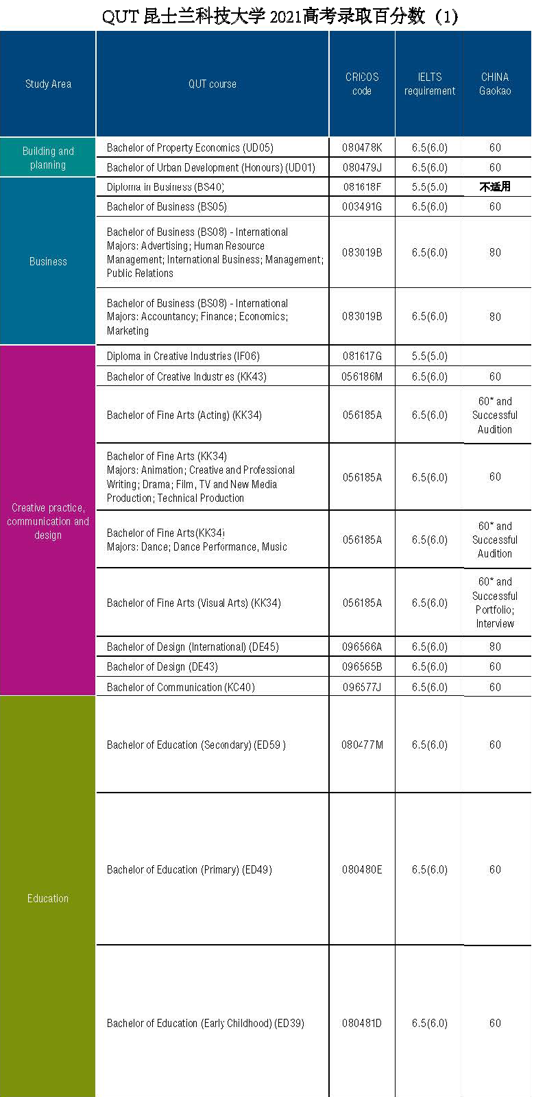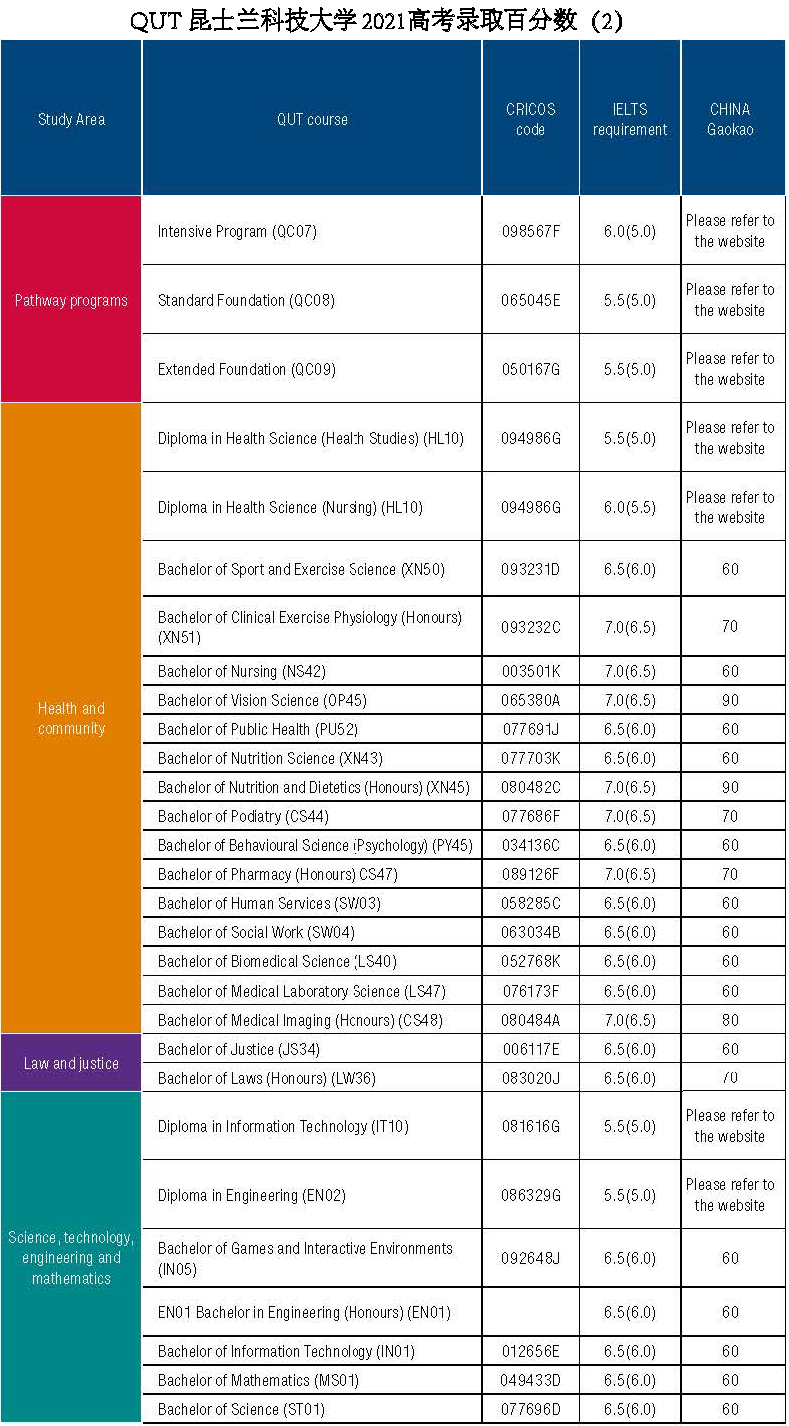 QUT的高考录取标准相对较松:大部分课程仅需高考60%(全国卷450分)即可,部分医学健康学位需70%、设计学位需80%。