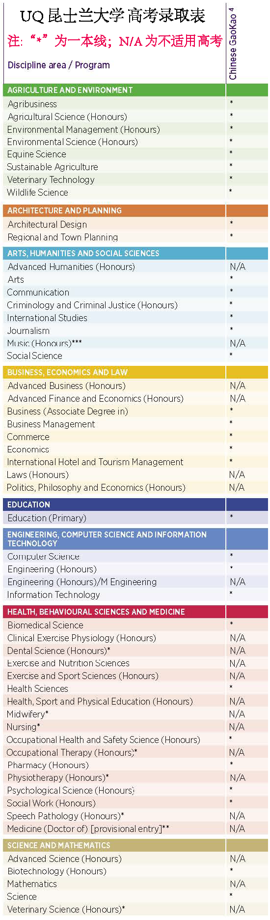 在高考录取方面,昆士兰大学大部分本科学位只需要同学们达到一本线即可。英语成绩方面,绝大多数课程需要总分6.5,单科6分水平;而护理、教育、法学、社工等专业,则需要雅思四个7。所有的荣誉(Honours)学位都不用于高考直升,同学们需要使用高三成绩申请IES预科班升学。
