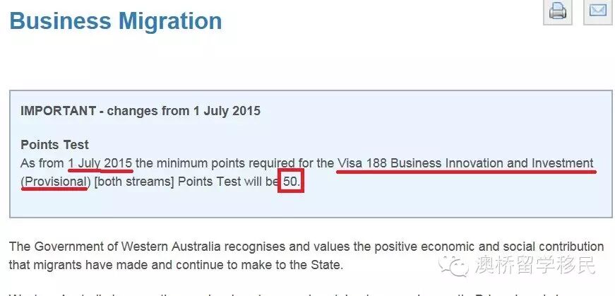 西澳的投资移民受邀分数将于2015年7月1日爆降至50分,以下是西澳官网消息截图:
