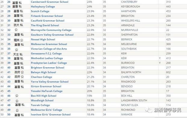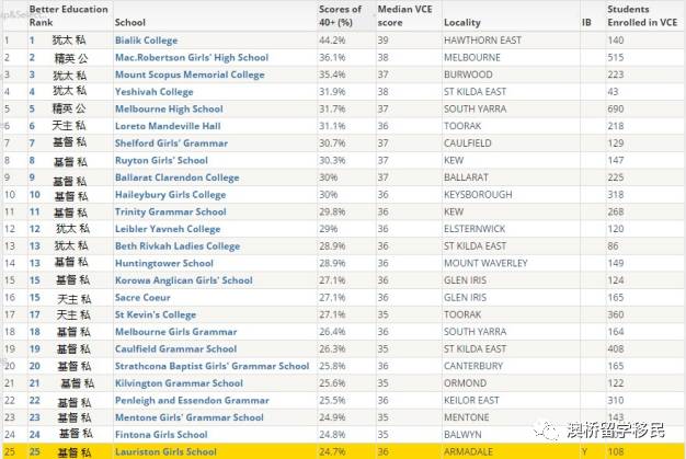 以下的学校排名是根据VCE成绩的中间分和40分以上人数的百分比。