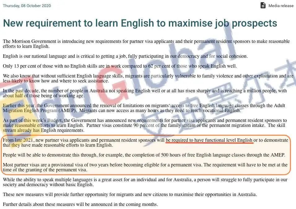 此外,移民局还发布了关于之前提到的配偶移民英语要求的详细内容:即配偶移民的申请人必须在申请801、100(PR)签证时,具有基本英语水平(雅思4.5)或证明自己已经付出足够的努力学习英语。
