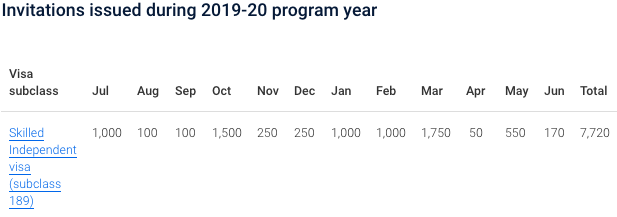 在刚刚过去的2019-20财年中,移民局实际下发了7720个189邀请,约是上一财年189配额人数的46%(这是由于部分签证包含副申请人以及移民局对部分名额的保留)。同时,在刚刚过去的本财年第一季度中,移民局又已经下发了610个189邀请。除去第一季度已经使用的配额,并考虑配额与邀请的比例,本财年的6500个189签证配额当前很可能仅剩约5000个。换句话说,今年10月到明年6月的这段时间里,移民局可能只会再下发2000-2500个189邀请,合每月200-300个。
