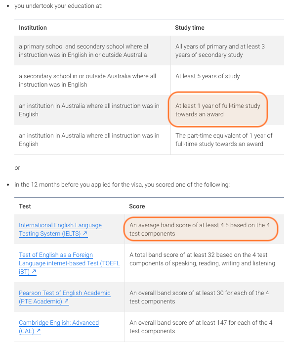 不过,各位准备申请配偶签证的小伙伴们大可不必担心:什么是“基本的英文水平(Functional English)” 呢?根据移民局的定义,只不过就是雅思每一科都考到4.5分即可。当然,如果申请人在澳洲境内接受过至少一年的全英文大学教育,或满足上图中的中小学教育,也将被自动认可。澳洲政府表示,增加这项要求的原因主要是为了让定居澳洲的配偶移民拥有更多的工作机会;不过,换个角度想想,是不是也能够增加本地英语培训、考试机构的收入呢?