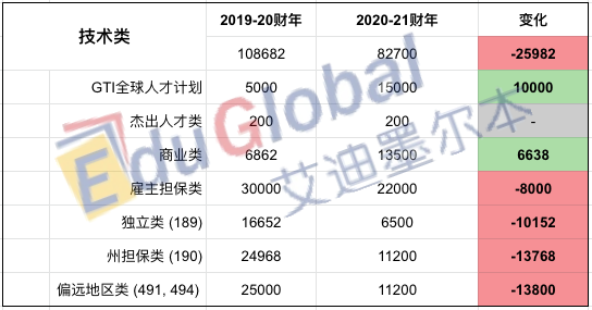 2020-21财年技术类移民配额中出现增长的分别是GTI全球人才计划(去年的3倍)和商业移民(去年的近2倍)两类,杰出人才移民(distinguished talent)则与去年持平,仍为200名。反之,往年最受欢迎的三大类传统技术移民名额则出现了断崖式的下跌:189独立技术移民降至6500名(下降60%);190州担保技术移民和491/494偏远地区移民则均降至11200名(下降55%)。