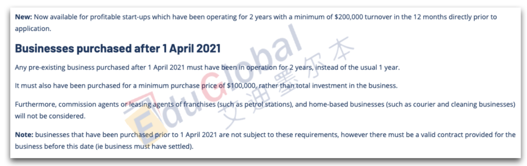 在2021年4月1号之后买入的生意要求最少已经经营两年,且需要投资至少10万澳币。(purchase price)