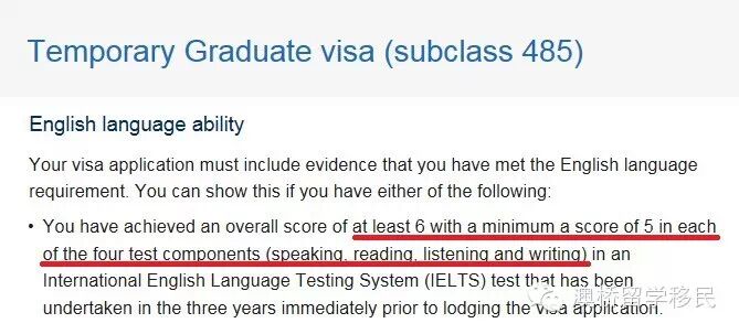 申请485签证只需雅思总分6分,单项成绩不低于5分,递交申请时成绩必须在3年有效期内。
