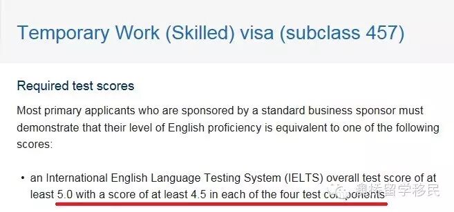 申请457签证只需雅思总分5分,单项成绩不低于4.5分。