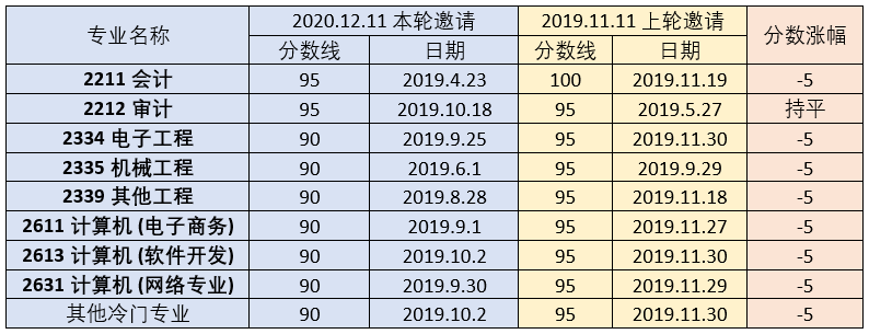 从上面的数据中可以很容易看出,绝大多数专业的门槛分数线都有5分的下降,因此最后获邀的申请日期也出现了明显的后退。换句话说,此次申请“清空”了大多数专业所有90分以上的申请人;获得90分的申请人中,在去年9-10月(或更早)递交的申请人均已经获邀。此次分数线唯一没有下降的一个专业是则是审计,依然保持95分。不过其最后获邀的申请人由5月底大幅度前进到了10月中旬,小艾预测之前审计专业积压的高分申请太多了,此次做了一个“大扫除”。综合这几次官报中财会行业(会计、审计)的邀请分数线和最后获邀日期,当前申请这两个专业移民的小伙伴们可谓仍然“people mountain people sea”,不愧是老牌的热门专业呀!